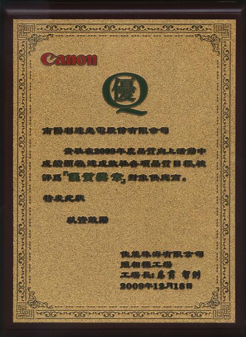 ??????? 12月18日,公司在佳能的供應(yīng)商“優(yōu)質(zhì)獎(jiǎng)?wù)隆北碚脙x式上受到表彰,并由佳能島貫工廠長頒發(fā)了優(yōu)質(zhì)獎(jiǎng)?wù)伦C書。